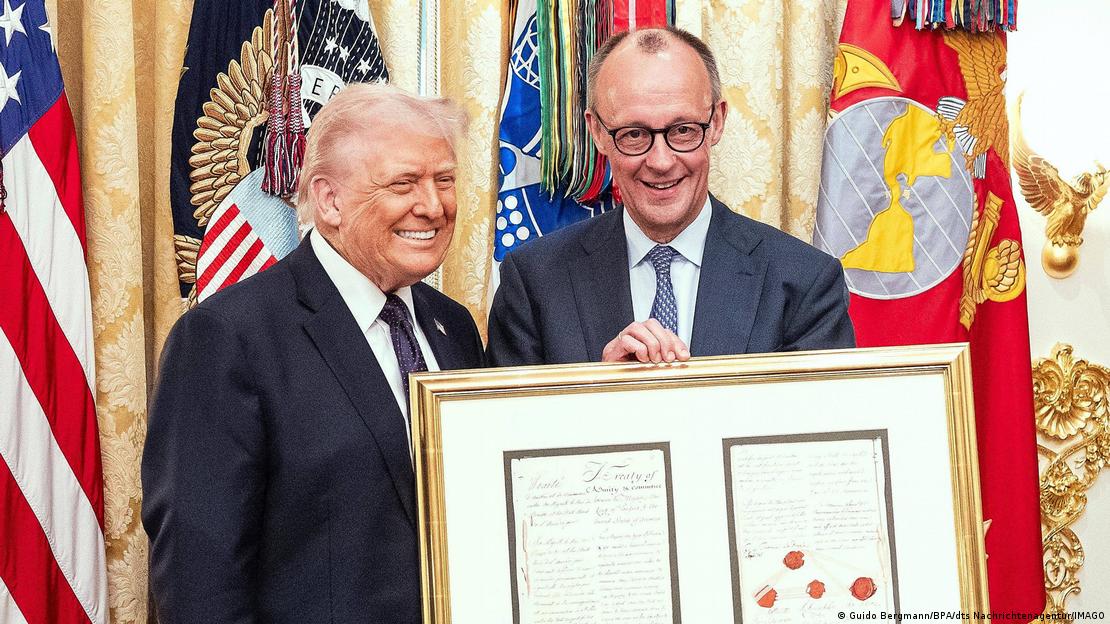 默茨送给特朗普一份礼物:1785年普鲁士与美国贸易协定的复制品图像来源: Guido Bergmann/BPA/dts Nachrichtenagentur/IMAGO