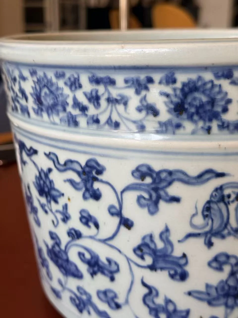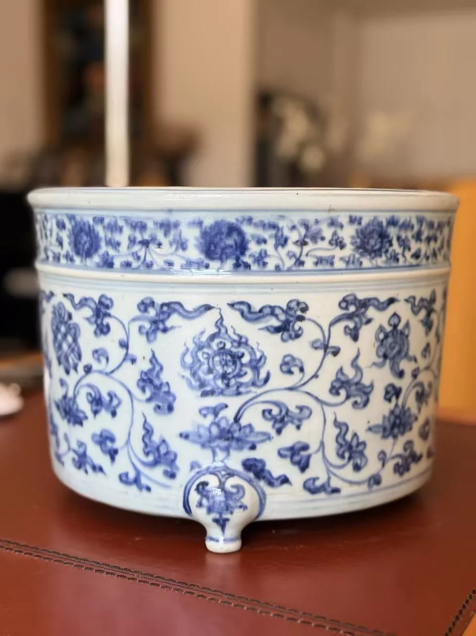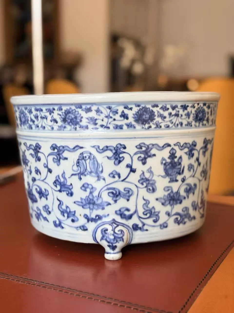 这支青花缠枝莲纹八吉祥炉的独特之处在于尺寸,高19cm、直径为28cm,平底三足,上部有一条凸出弦纹,口沿呈唇形。外壁绘制由缠枝莲纹围绕着的八宝纹饰,青花发色纯净且略带晕散。在成都一明代宦官墓穴中曾出土相同的一支炉,只是尺寸略小(直径25cm),被收录在张柏主编的《中国出土陶瓷全集》中第十卷,因其书中年代标为明嘉靖,故在2012年纽约佳士得春拍中也被标注为明嘉靖。但我个人感觉或许略早(正德),苏富比纽约和伦敦的专家也有相近观点,所以此次上拍,年代大概率改用十六世纪