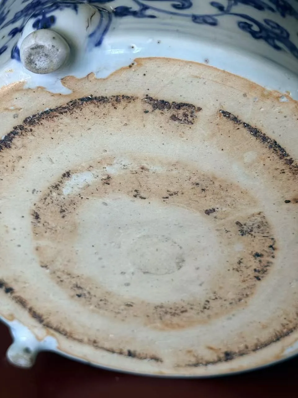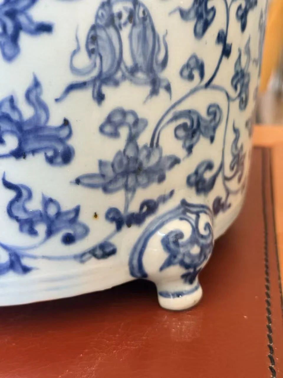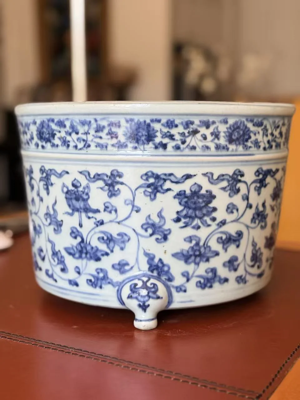 这支青花缠枝莲纹八吉祥炉的独特之处在于尺寸,高19cm、直径为28cm,平底三足,上部有一条凸出弦纹,口沿呈唇形。外壁绘制由缠枝莲纹围绕着的八宝纹饰,青花发色纯净且略带晕散。在成都一明代宦官墓穴中曾出土相同的一支炉,只是尺寸略小(直径25cm),被收录在张柏主编的《中国出土陶瓷全集》中第十卷,因其书中年代标为明嘉靖,故在2012年纽约佳士得春拍中也被标注为明嘉靖。但我个人感觉或许略早(正德),苏富比纽约和伦敦的专家也有相近观点,所以此次上拍,年代大概率改用十六世纪