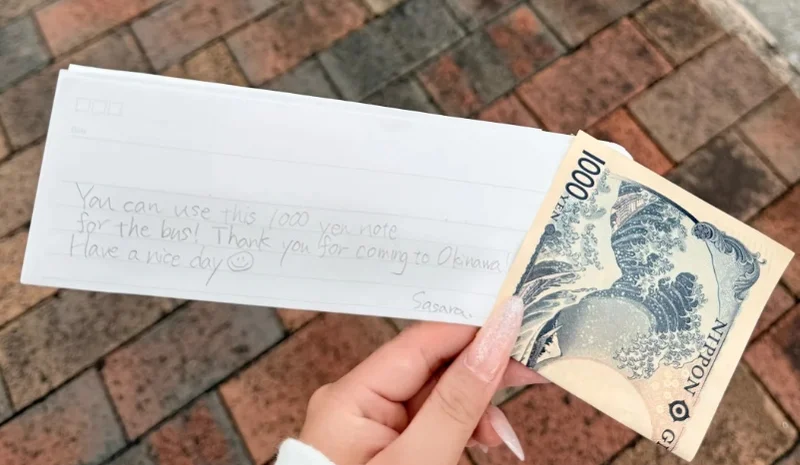 那张1000日元或许只是一段旅途中的小插曲,但对当事人来说,它已经变成了一段会记很久的记忆。很多年以后,当她回想起冲绳,记住的也许不仅是温暖海风和美丽街景,还有公交车上那个认真写下纸条的小女孩,或许人才是一个地方最靓丽的一道风景线。