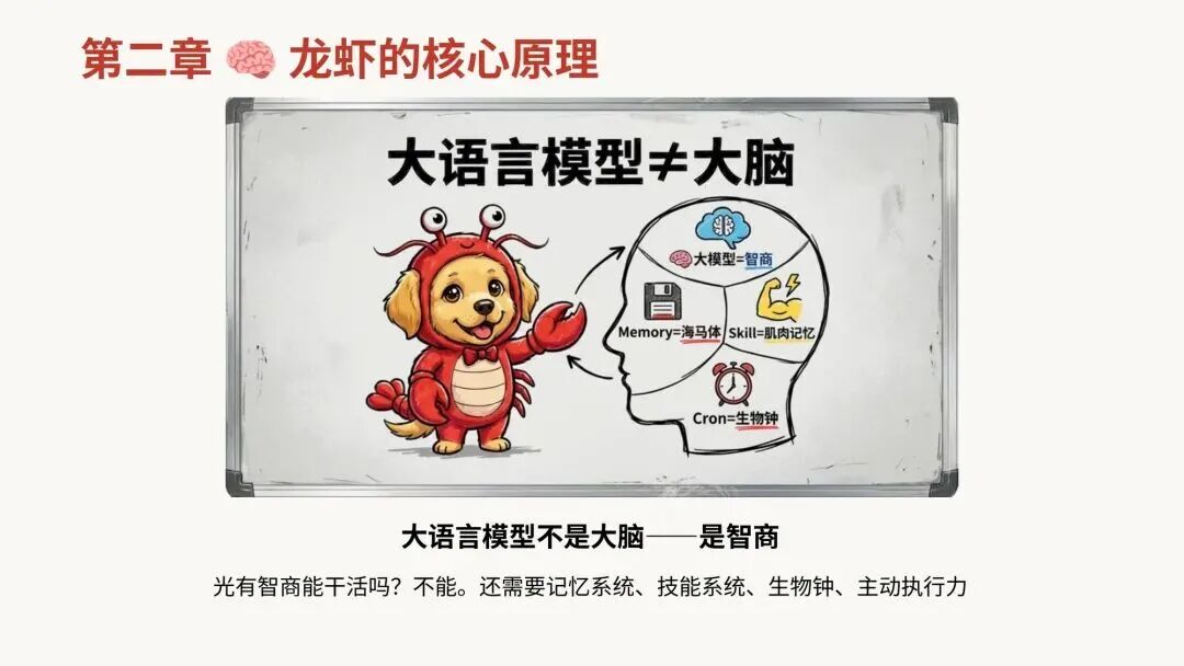 龙虾做的事,是把这些全部补全:大模型是智商,记忆系统是海马体,Skill是肌肉记忆,Cron是生物钟,多通道接入是感知器官。