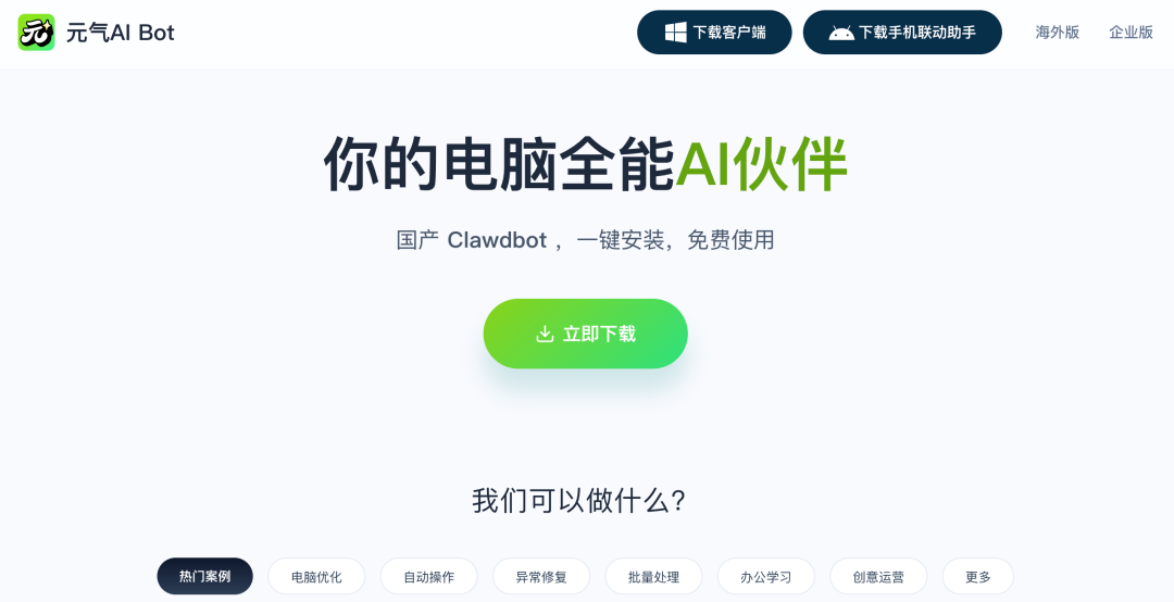 在国内市场,猎豹移动推出了「元气AIBot」,采用自主研发的框架,同样强调极简和开箱即用。