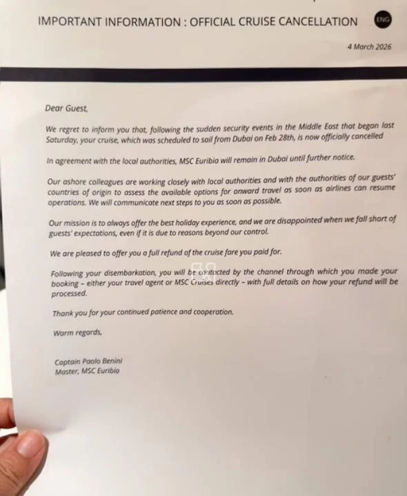 3月5日,有船上的中国游客在社交平台发帖称,4日接到船长的通知,该邮轮将取消后续行程。该游客展示的通告中称,很遗憾地通知您,在上周六(2月28日)开始的中东突发安全事件后,您的邮轮原定于2月28日从迪拜启航,现已正式取消。经与地方当局达成协议,MSC Euribia将留在迪拜,直至另行通知。