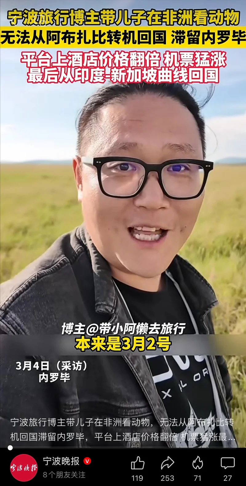 比如浙江宁波一对父子,趁着春节假期到非洲看野生动物。