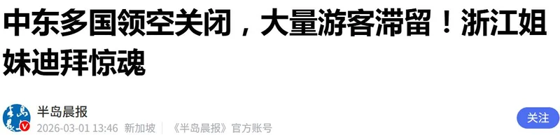 因中东各国关闭空域、航道封锁,数万名旅客也遭遇滞留,其中也有不少中国游客。
