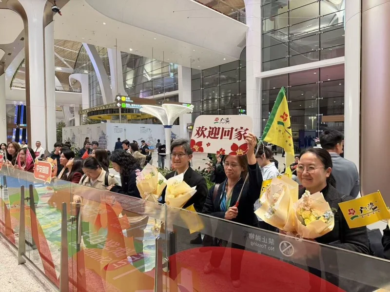 到站的时候,不少工作人员举着“欢迎回家”、“平安回国”的示意牌迎接他们。还有不少记者上前询问旅客这一路上的心情与感受。