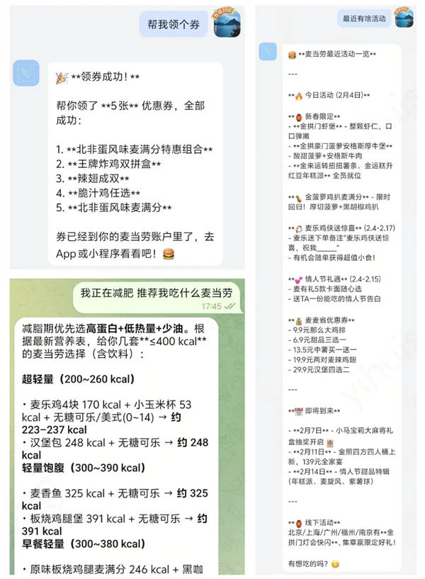 OpenClaw是一款开源AI智能体,可通过对话界面实现多样化定制功能,例如作为企微微信专属营养师,为用户推荐减脂期麦当劳餐食搭配,或自动领取平台优惠券,覆盖生活服务等实际场景。