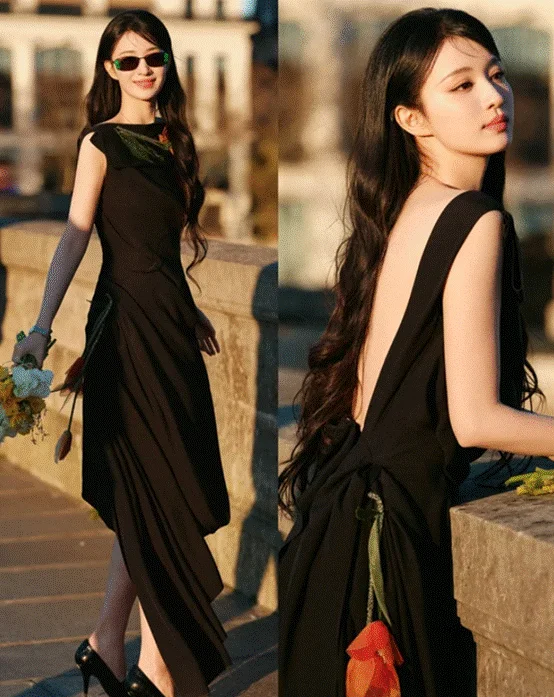 黑色长裙上点缀着橘红色的立体花卉,不规则的领口裙摆更灵动飘逸,露背的设计带有一丝性感。