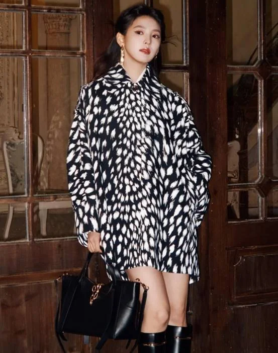 官方大片中,她身着黑白印花廓形外套,搭配黑色长筒靴,夜色之下,整个人呈现着不同以往的冷峻气场。