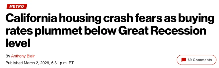 据房地产数据提供商Attom统计,过去三年(2023—2025年)加州房产成交量为954,423套,较2007—2009年“大衰退”(Great Recession)前的1,250,000套下降了24%。由此引发市场对全州房市可能崩盘的担忧。