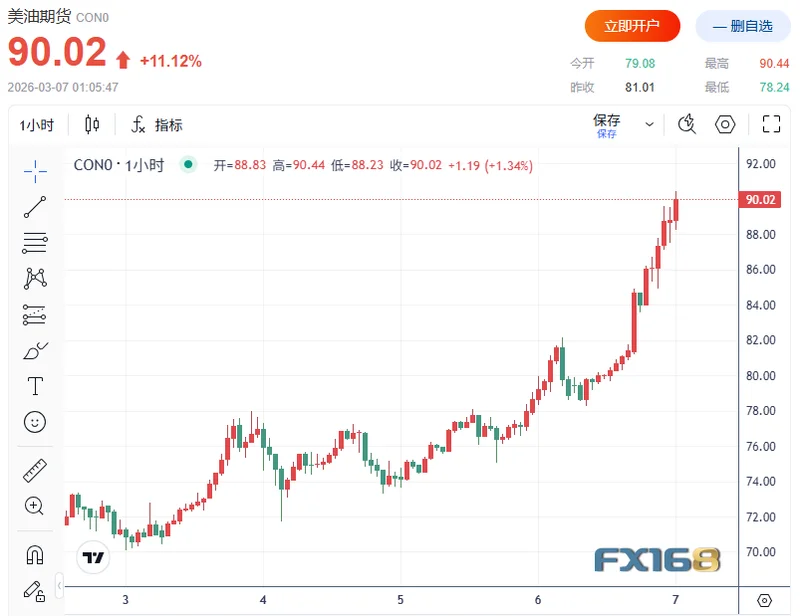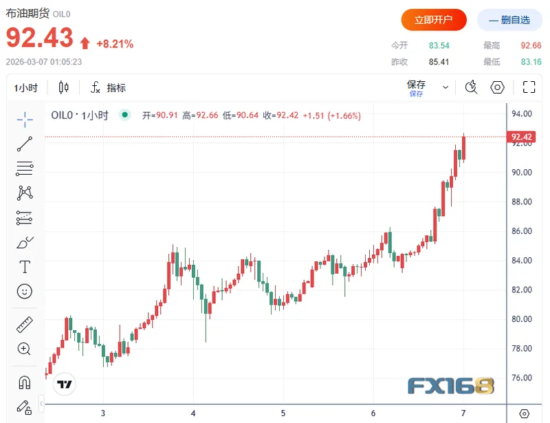 FX168财经报社(北美)讯 随着中东冲突持续升级并迅速冲击全球能源供应链,国际油价周五大幅飙升。全球基准布伦特原油期货近两年来首次突破90美元/桶,市场担忧霍尔木兹海峡航运几乎停摆将严重扰乱全球石油供应。本周油价累计涨幅已超过20%,成为近年来最剧烈的上涨之一。