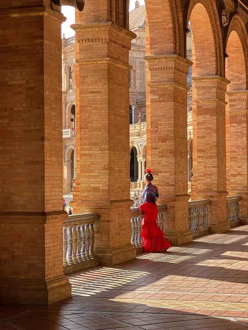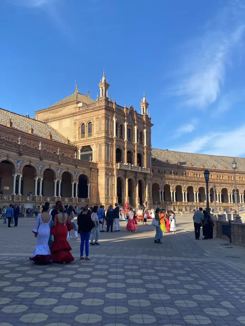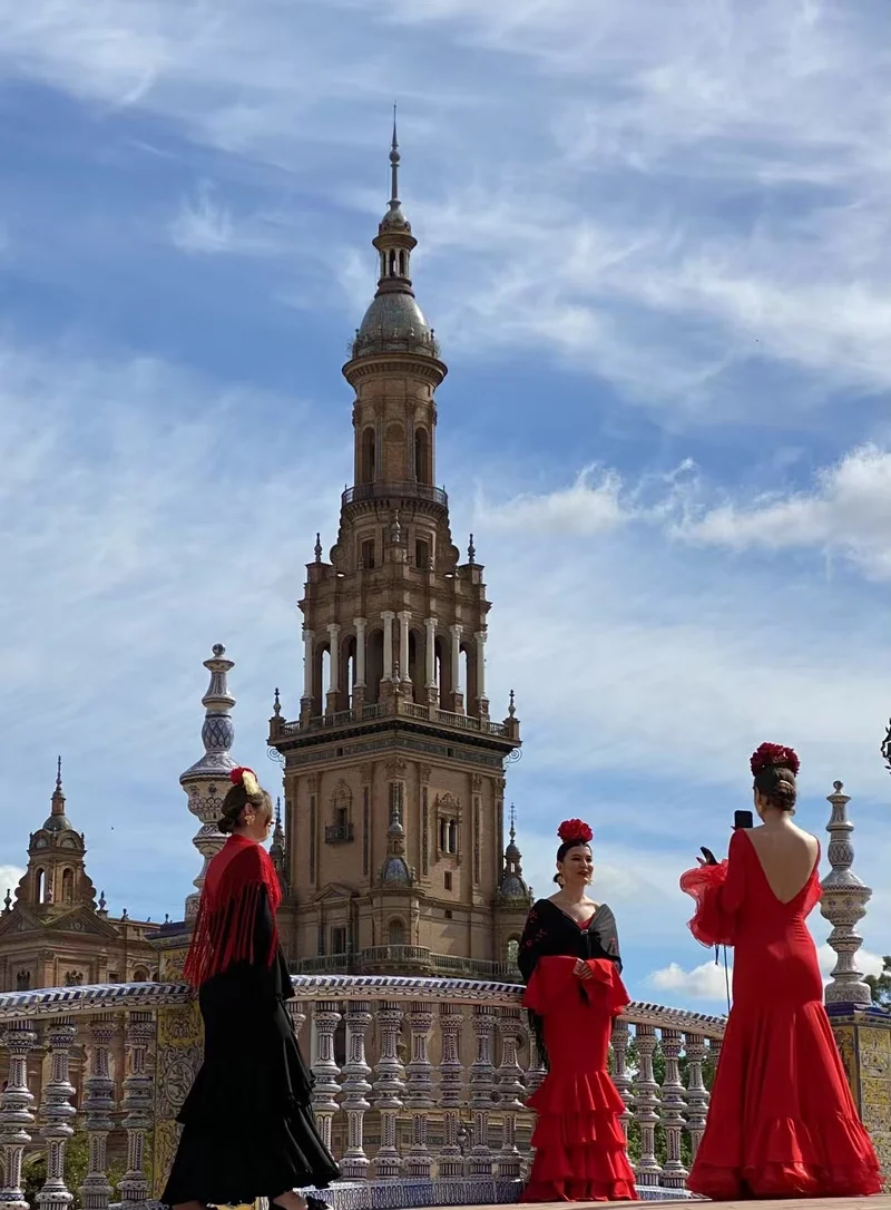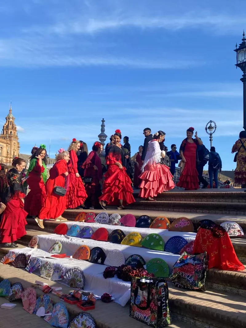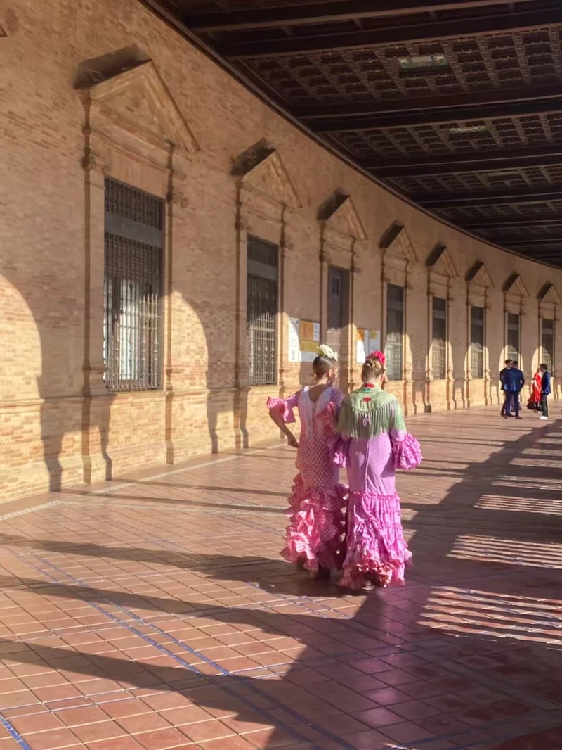 在西班牙的塞维利亚(Seville),最著名的景点当然是她的西班牙广场。这一天,应该是一个特别的节日,在去广场的路上,能看到许多穿着传统长裙的女郎。