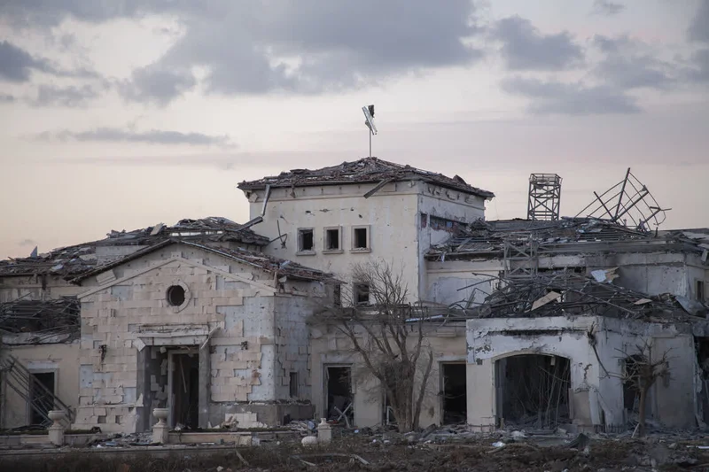 2022年3月13日,在伊拉克库尔德自治区首府埃尔比勒,美国驻埃尔比勒领馆附近的建筑在导弹袭击中受损。新华社发(达尔沙德摄)