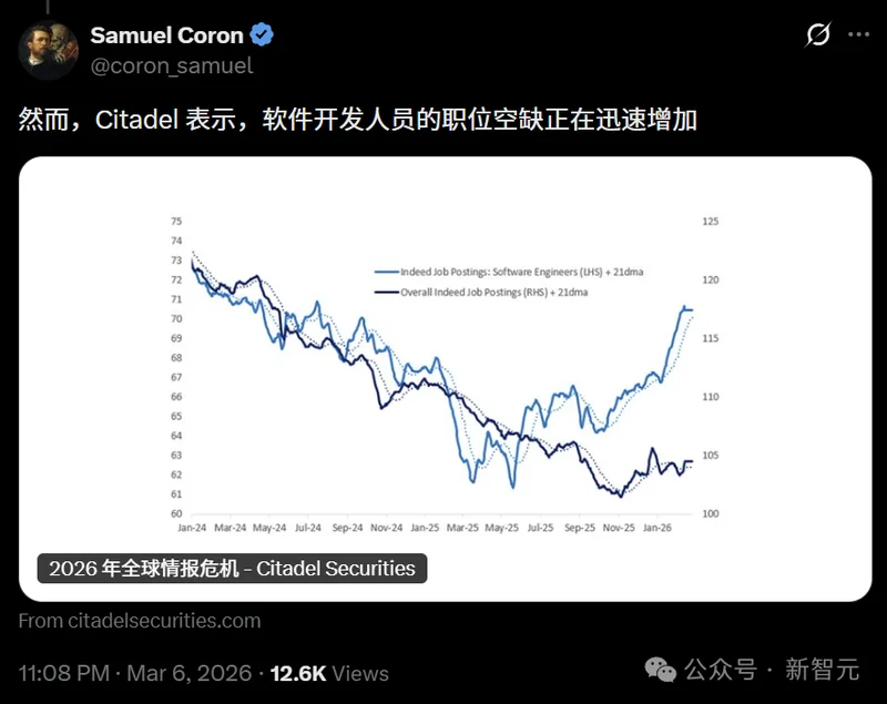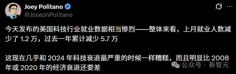 当前科技就业的萎缩程度,已经几乎追平2024年科技衰退最惨烈的时刻,而且比2008年和2020年的两次危机还要严重。