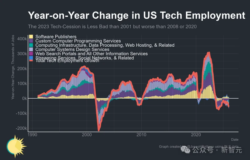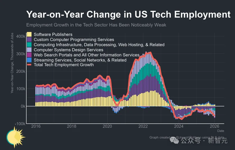 从1990年到2026年的美国科技就业年同比变化图上,当前的下坠曲线从2023年开始一路走低,规模和持续时间上,只有一个时期能与之相比——2001年互联网泡沫破裂。