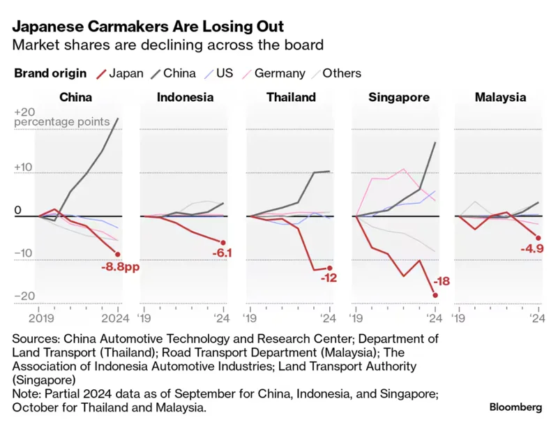 在印尼市场,中国品牌的数量已达到16个,2025年销量翻番,比亚迪在进入印尼才短短两年,就干成了销量第三的品牌,广汽埃安更是实现了451.5%的增长 ,而霸主丰田去年的销量下滑了30%;在马来西亚,2025年最畅销的十款纯电动汽车中,七款都来自中国;在南非,中国乘用车的市场份额于2025年上半年达到了16%,与之对应,丰田田的份额下降了15%,是当地跌得最惨的品牌 ……