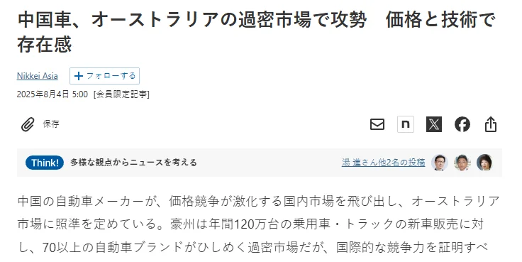 面对中国车奋起直追的势头,从去年开始,日本媒体就一直在“不安Desu”,日经打出的标题是,《中国汽车在拥挤的澳大利亚市场中发起进攻,价格和技术都占有优势》,NNA更是直接预测,《中国品牌以惊人的速度将产品推向市场并扩大规模,日本车将失去长期领先的地位》,到2035年,中国对澳出口的汽车,将占新车市场43%的份额,日本只剩22%。