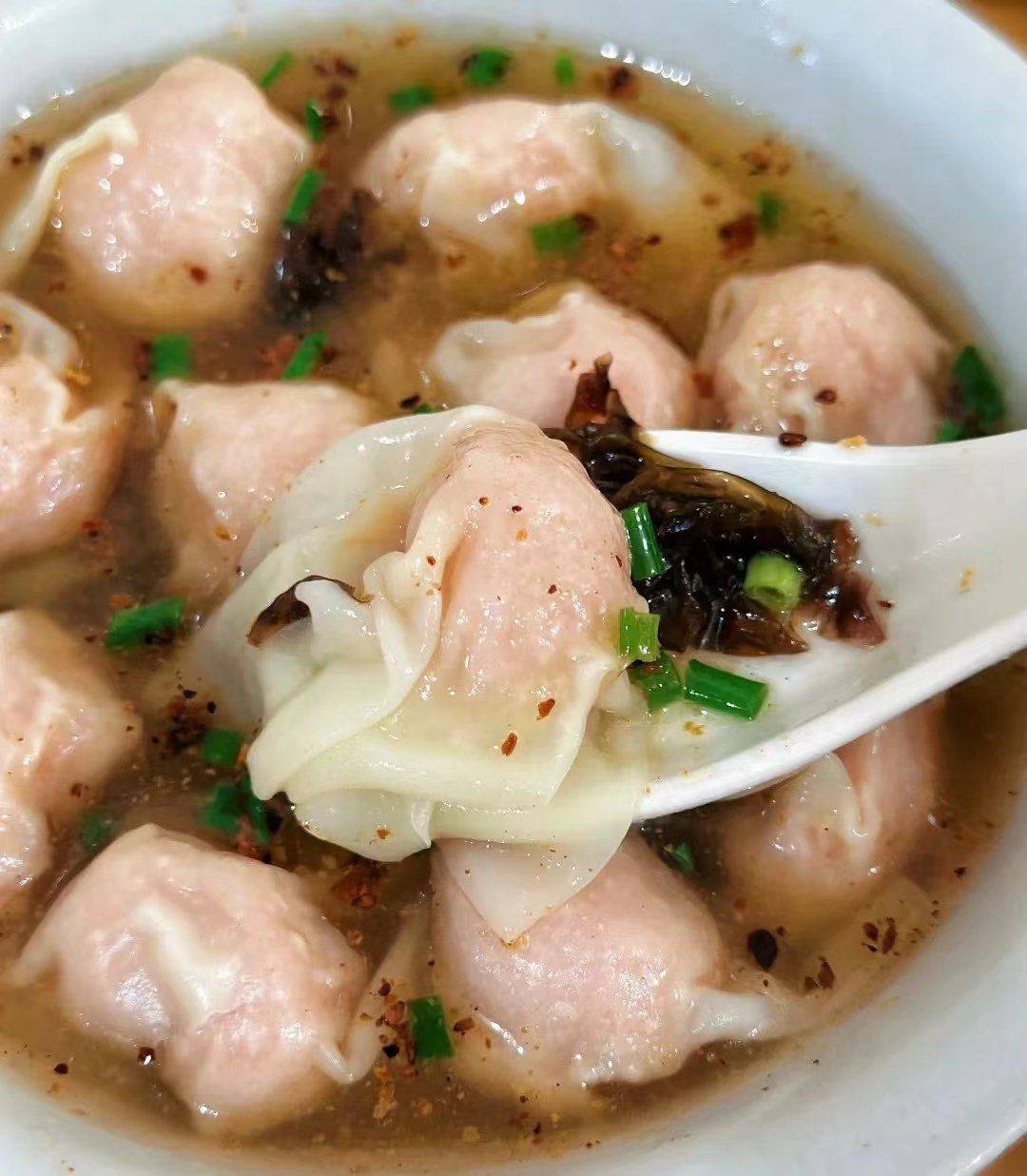 闽北扁食的极致代表,薄到能透光的古早味。面皮用木槌手工捶打至蝉翼般透亮,肉馅选猪后腿肉千锤百炼,弹牙紧实。猪骨清汤一滚即熟,撒上葱花、胡椒粉,入口皮滑馅鲜,清淡回甘不油腻。小巧一颗,鲜到舌尖打颤,是建阳人从早到晚都离不开的暖心小吃。
