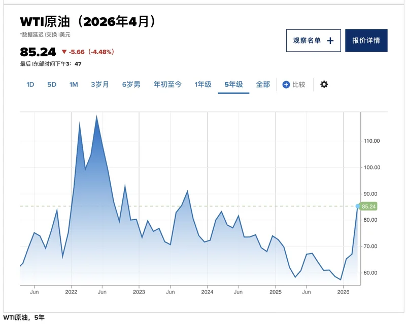 原油期货收盘上涨4.26%,报94.77美元。随着海湾阿拉伯国家因伊朗威胁导致船只无法通过海峡而削减产量,WTI一夜间飙升至119.48美元。