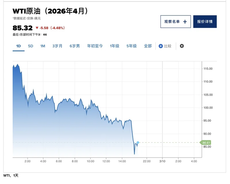 截至东部时间下午3:37,美国原油下跌6.19%,报每桶85.27美元。全球基准布伦特指数下跌4.6%,报每桶88.43美元。