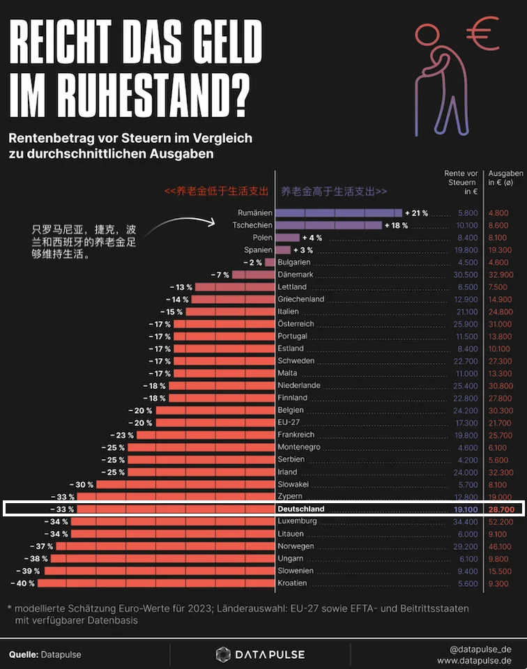 德国被Datapulse 的分析报告明确列入养老金不足以维持平均生活水平的“赤字国家”之列。
