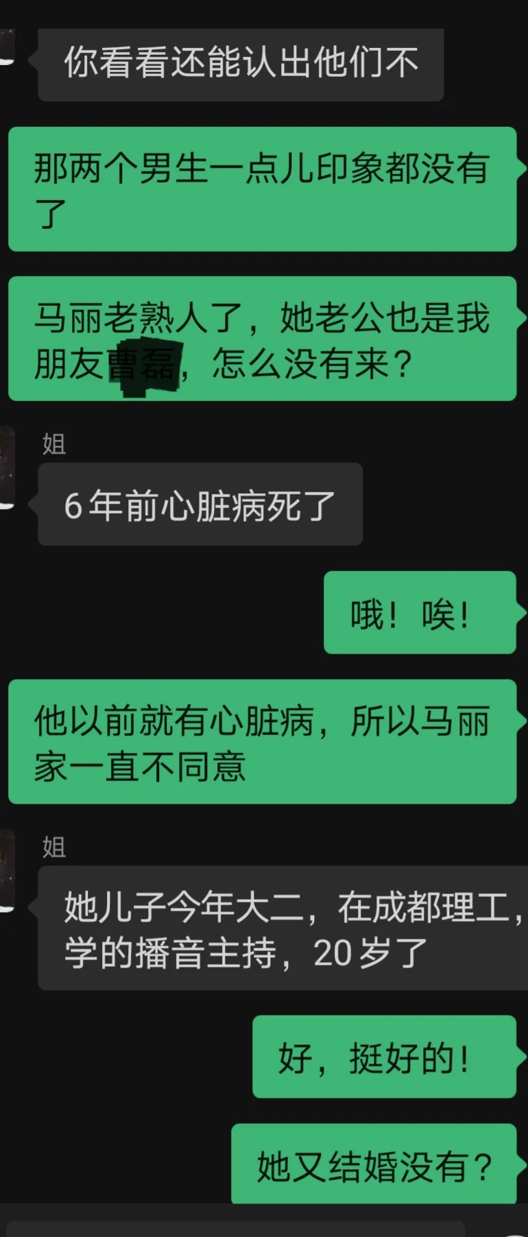姐姐说马丽一直也没有再结婚,现在经营着一家小饭店,他们这次聚餐就是在马丽的小饭店里吃的。