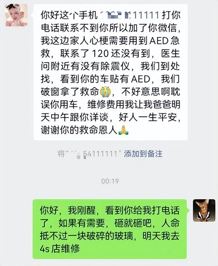事后,他加上了车主微信,说明了情况。车主李先生的回复,让所有人动容:“看到你给我打电话了,如果有需要,砸就砸吧,人命抵不过一块破碎的玻璃。”