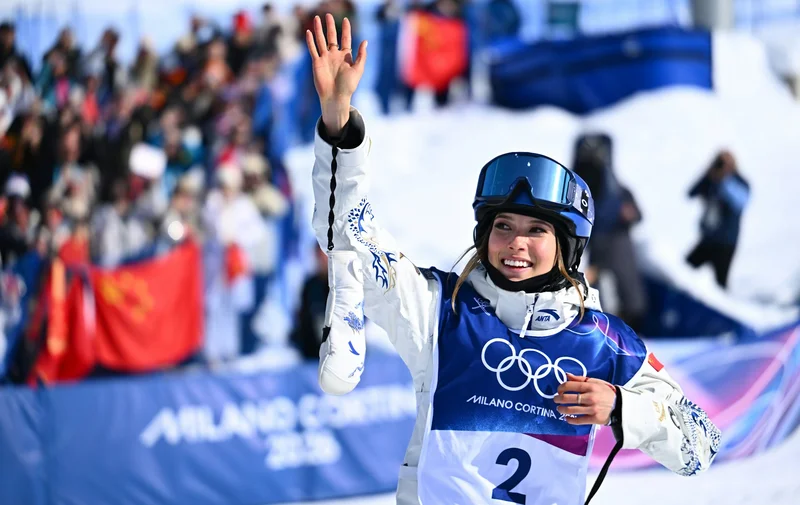 2月22日,米兰冬奥会自由式滑雪女子U型场地技巧决赛,中国选手谷爱凌夺冠后向观众致意。 (新华社)