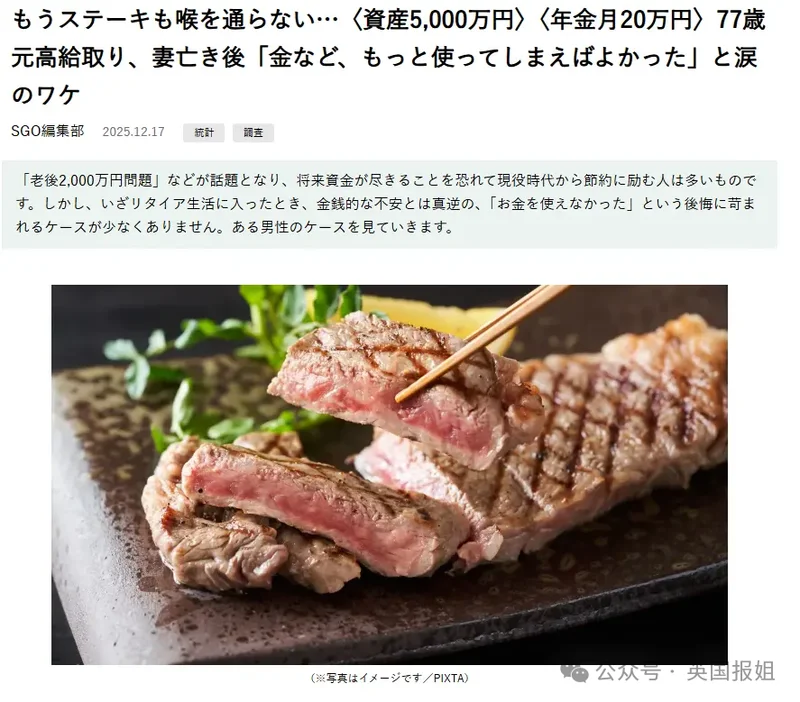 ——这一点之前也有一个相关报道,说是77岁的佐藤健二一直对花钱过度谨慎,甚至在60岁退休的时候,虽然储蓄绰绰有余,却还是选择了返聘再就业,一直干到了妻子因为胰腺癌去世,才猛然醒悟。