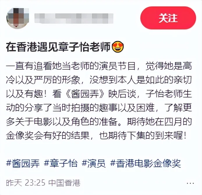 近日,有网友在香港参加活动时偶遇章子怡,晒出了同框合照。