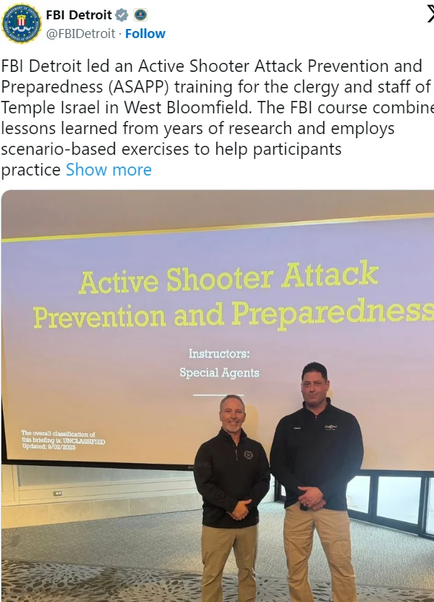 近期,由于中东局势持续紧张,美国多地犹太机构的安保等级明显提升。美联社和路透社都提到,Temple Israel 本身也处在加强警戒之中。值得注意的是,就在两个月前,FBI底特律分局刚在 Temple Israel 为教职人员和工作人员进行过“枪击袭击应对培训”。