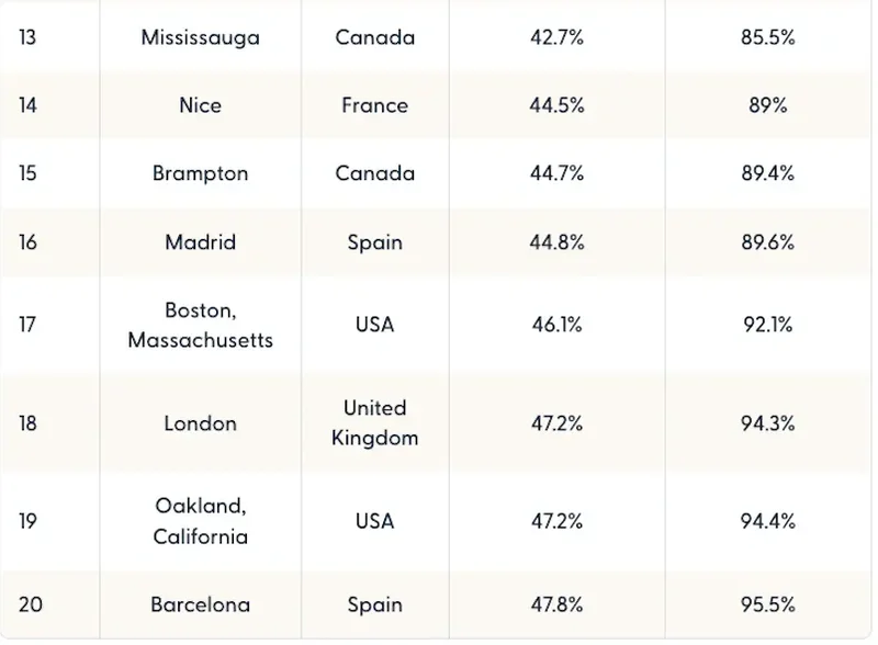 第二至第四位依次为洛杉矶(28%)、Long Beach(32%)和圣地亚哥(33%)。
