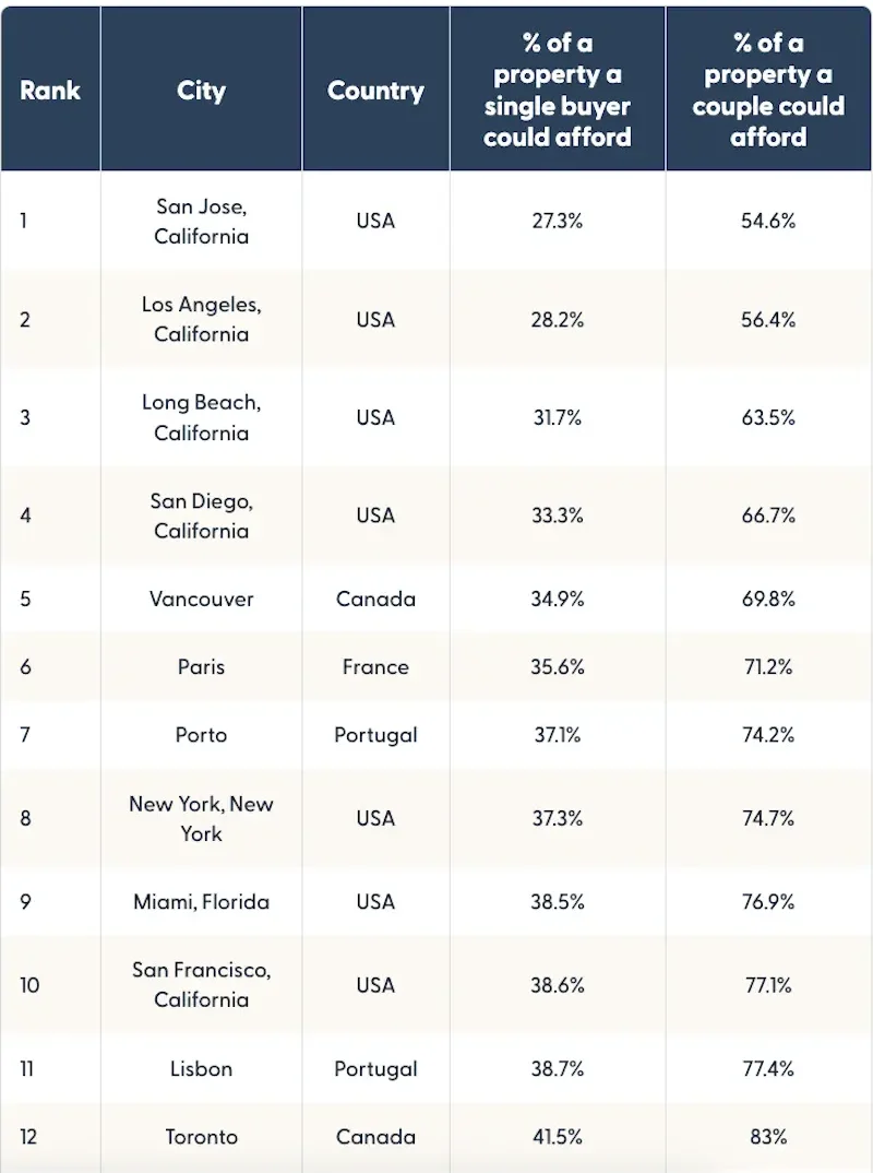其中前四位全部位于加州,其中第一位是圣荷西,普通人的收入只能负担得起平均房价的27%。