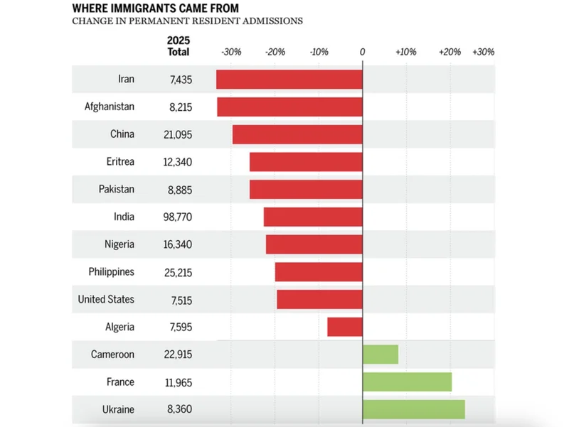 永久居民:下降 29.6%,主要因经济类移民整体 -19%,EE 系统分数门槛提高、优先本地劳动力。