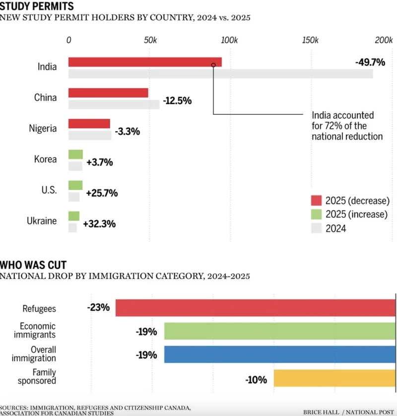 这直接源于政府对国际学生项目的收紧(如新上限和资金证明要求),印度学生多依赖低成本学院项目,受打击最大。临时外国工人整体下降 12%,印度工人(常见于卡车司机、农业)占比高,预计降幅类似或更高。