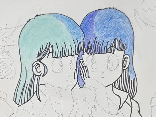 右侧 人物身体 肤色,我先是用了 跟左侧一样的两种彩铅 颜色搭配,可是笔痕 还是很难消除(sorry 忘记照相留念。嘿嘿~) 所以 最后 我选了一个 非常非常 浅色的 marker 加了一层,感觉这个效果细腻,肤色也更加 stand out 了,我很满意!