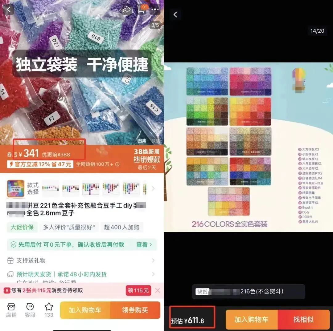 靠谱商家往往意味着更贵的价格、更少的分量。某同款拼豆套餐,普通店铺售价341元/221色,而某知名店铺同款售价则高达611.8元/216色,价差近一倍。且后者每包豆子500克,重量仅为普通店铺的一半。