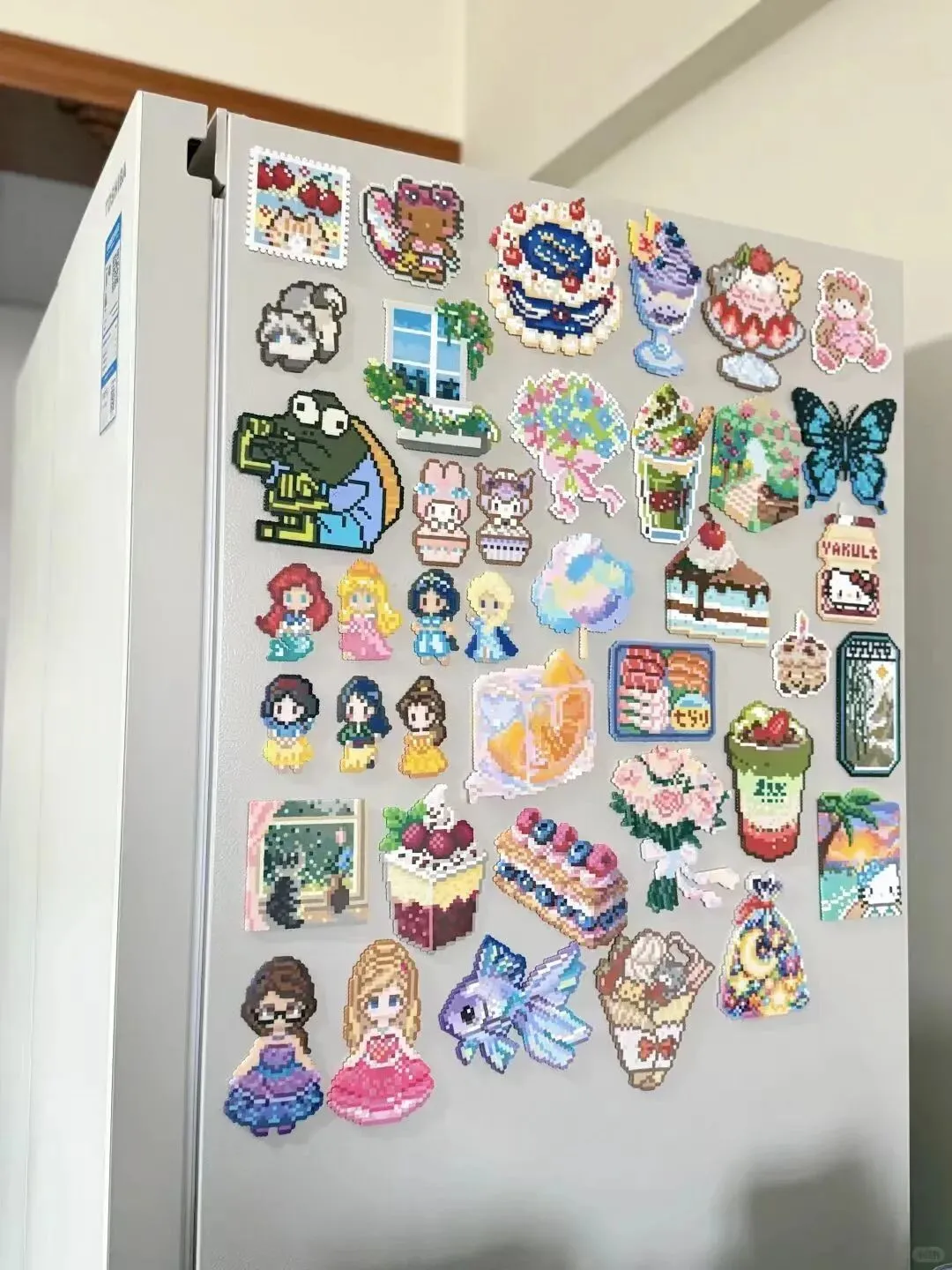 网友@咸菜主任家的冰箱上,贴满了她的拼豆作品