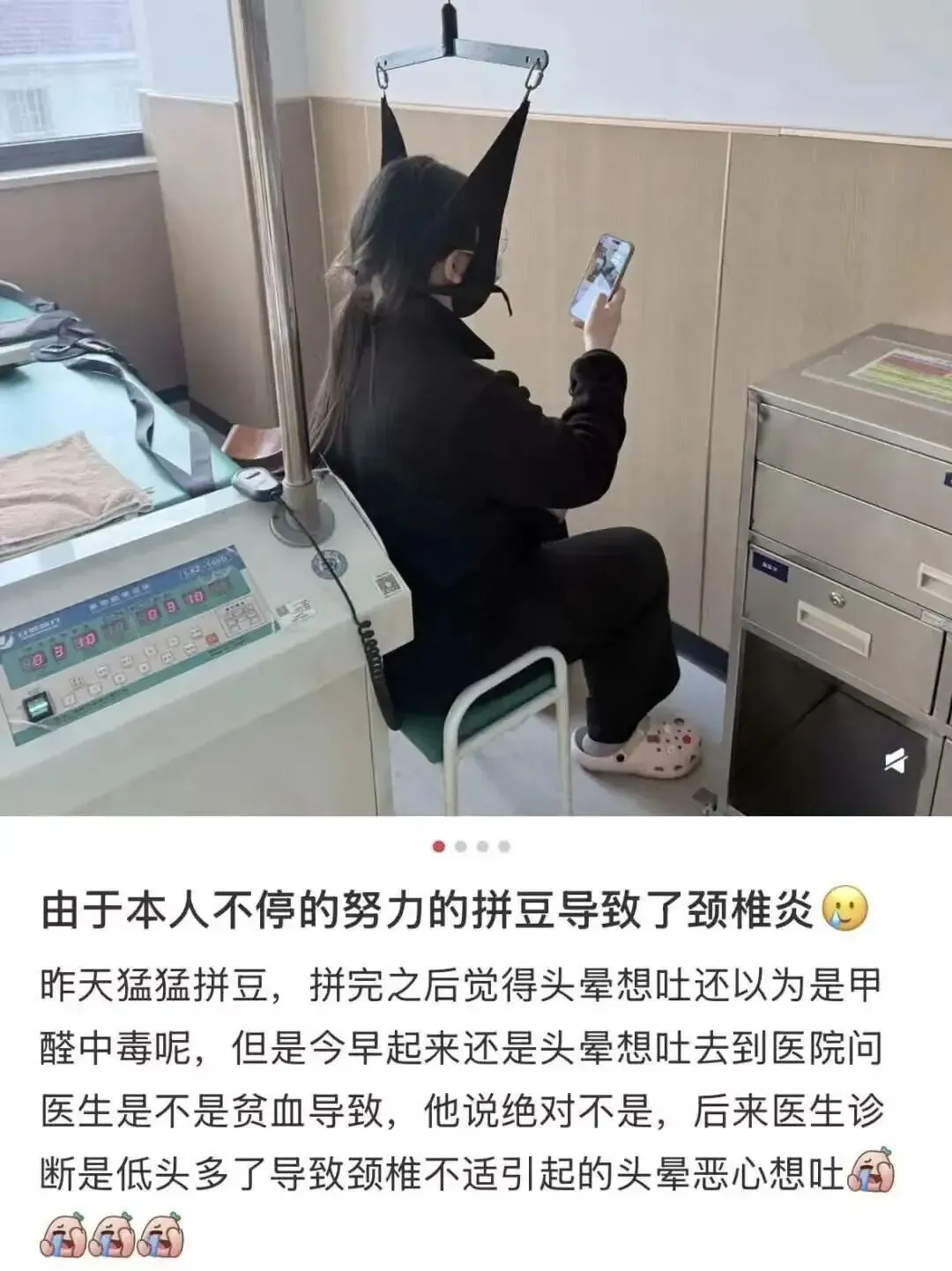 有网友在连着低头数个小时后,直接把自己拼进了急诊。还有人因为长时间拼豆身体开始犯恶心,去医院一查被确诊了颈椎炎。