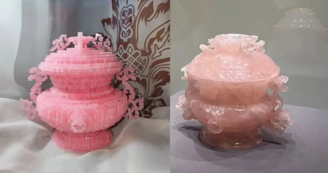 它甚至可以像积木一般,复刻出乾隆时期的芙蓉石蟠螭耳盖炉,就连原物温润剔透的玉石质感,也能被巧妙再现。