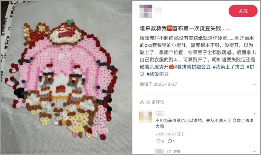 在社交平台搜索“拼豆义诊”,会发现大量网友晒图发帖求助。有的因熨烫手法不到位,导致图案受热不均、整体变形;有的是豆子融化不充分,成品表面布满细密小孔;更有人因熨烫过久,整幅作品彻底融化、粘连拉丝,只能无奈重来。
