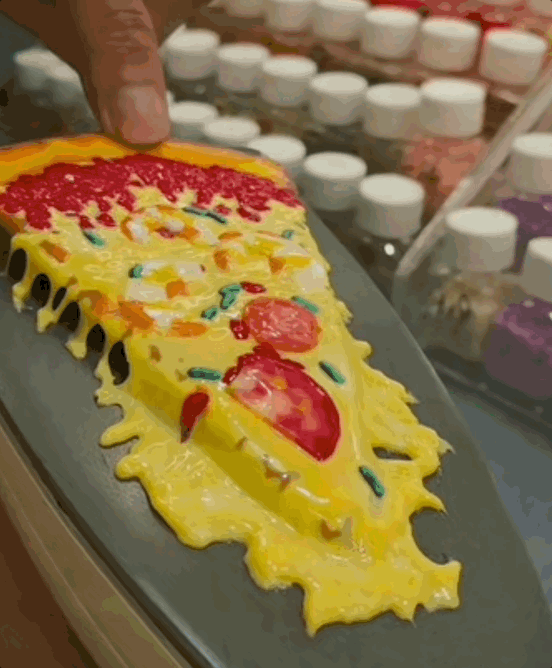 手工博主在质感上下功夫,通过精准把控熨烫时间,让豆子形成不同程度的融化效果。融化的豆子既可以是披萨中拉丝的芝士,也可以是咖啡中精美的拉花。