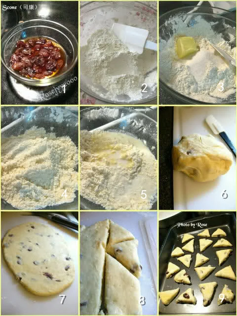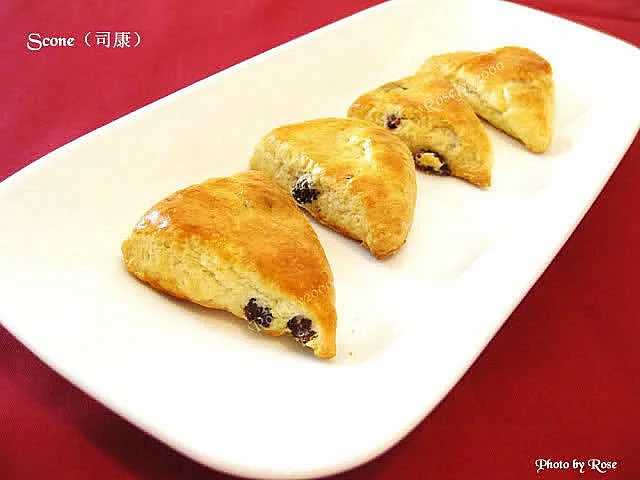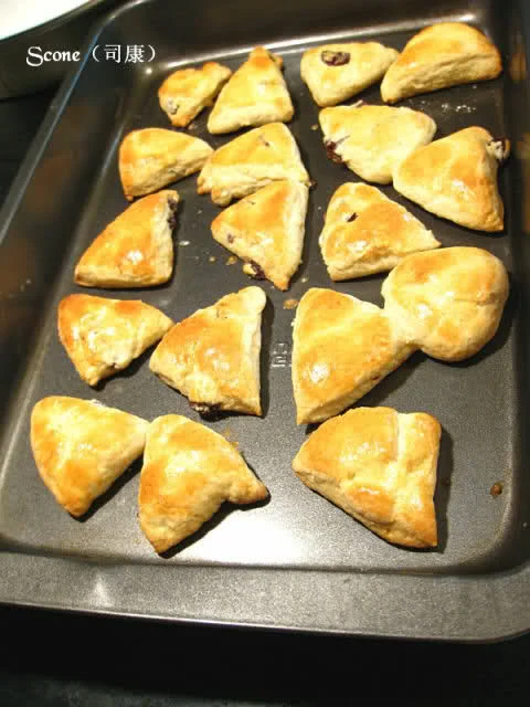 司康(Scone)是一种英式烘焙点心,介于面包与饼类之间,但通常更接近快速面包(quick bread)类点心。看过君之和文怡的烘焙书,里面都有提及司康的起源、配料和做法,也上网搜过下其他人做司康的方法,大同小异,但教了我一招,用葡萄酒泡葡萄干,因偶没有蔓越莓,就用葡萄干代替,就大胆试了这方法,真的很不错。本人综合了上述两种配方和方法,在用料上用了君之的配方,有形状上采用了文怡的成品造型,觉得做三角形比较少边角料,切开面块成长条,用不同方向的45°角度切就可以了,也比较符合原始造型。