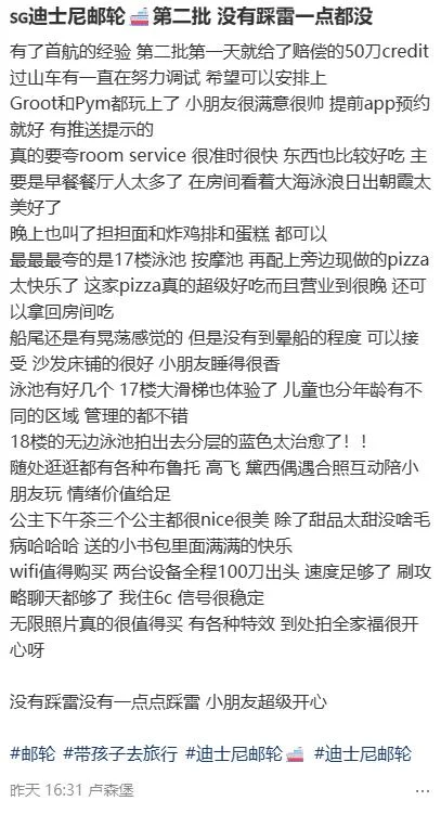 她特别提到,自己去过不少邮轮首航,皇家、MSC都赶上过,没有一次特别顺利的,而大部分首航客人对迪士尼服务其实也不算特别不满,工作人员一直在很努力地创造快乐情绪,只是差评在社交媒体上被放大了。