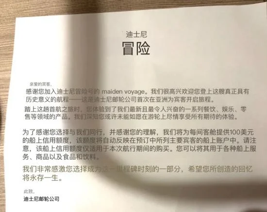 网友晒出迪士尼探险号首航最后一晚的信