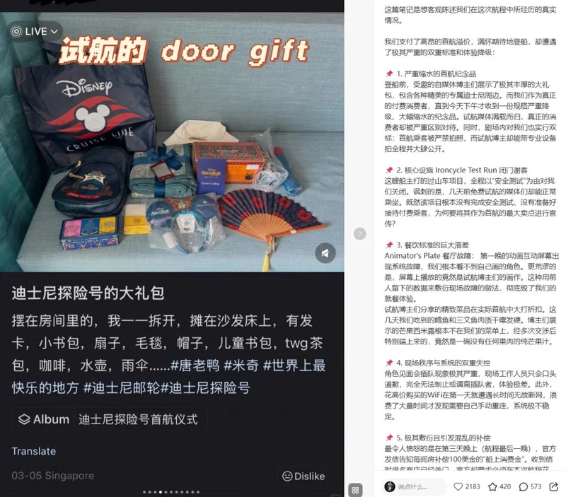 爱达邮轮那时候只是蹒跚学步的孩子,犯错可以原谅,迪士尼是全球顶级IP,消费者的期待天花板本来就高,失望摔下来会更疼。