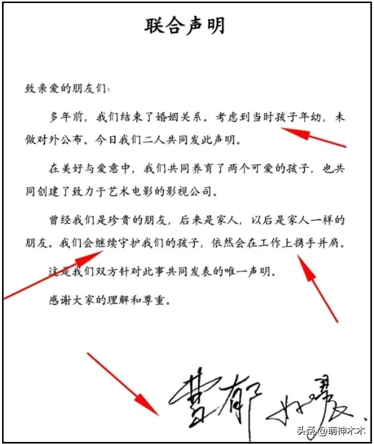 明面上,姚晨和前夫曹郁都保持了体面,二人联合发布声明,写上手写签名,强调双方婚姻结束多年,因为孩子年幼才没公布,未来还会一起抚养孩子,还要继续一起开公司,打拼影视事业。