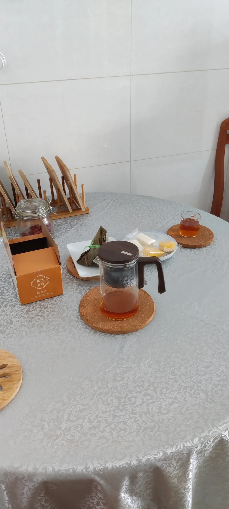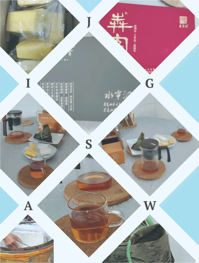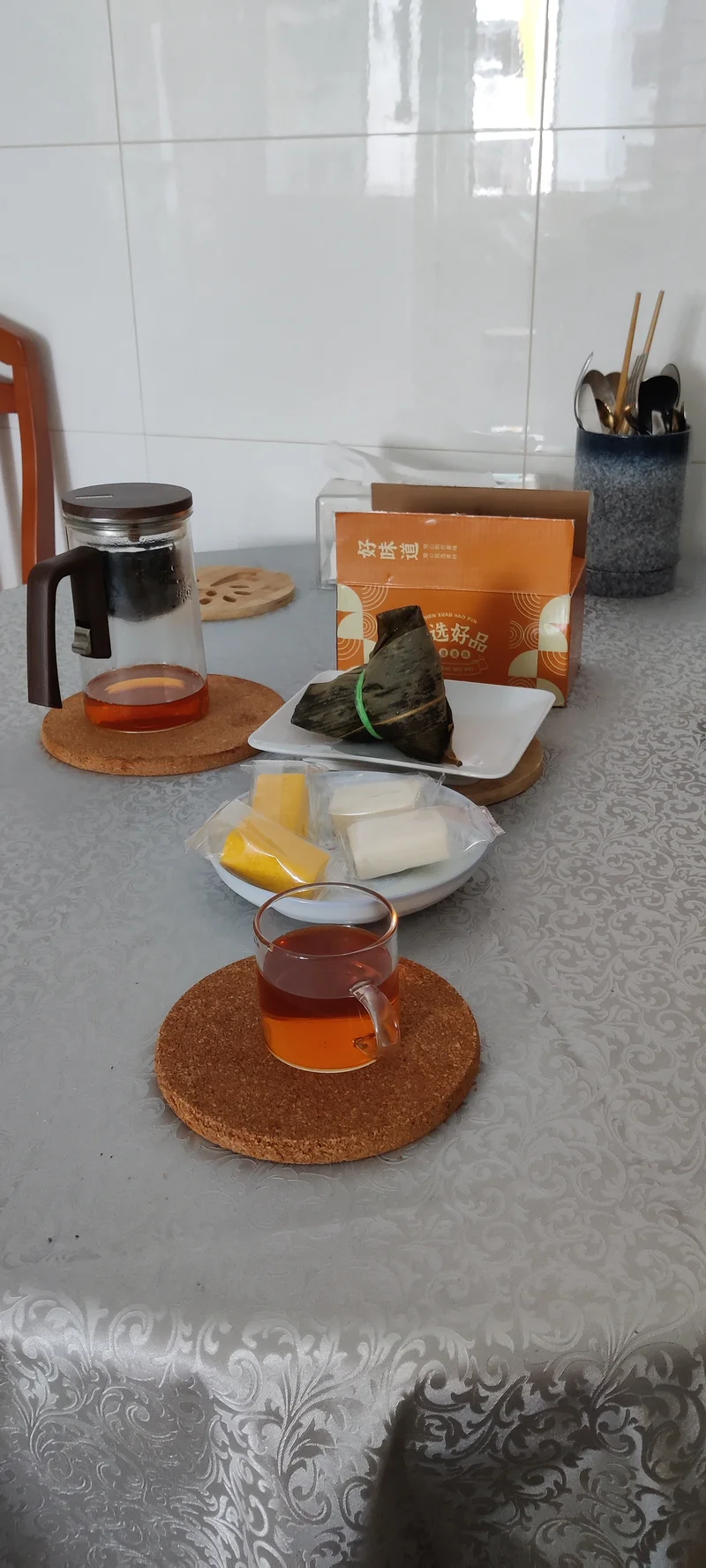 今天早点就请它们上桌,一杯茶+四块茯苓糕+一个本地肉粽。