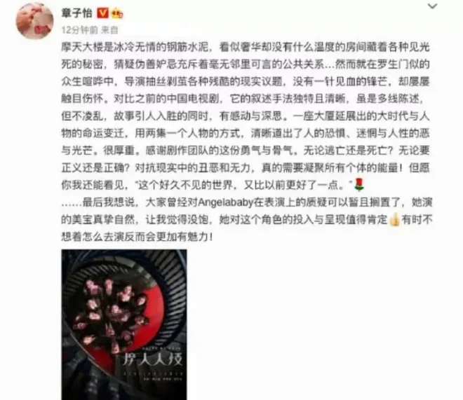 比如《摩天大楼》播出后,章子怡直接一篇长文表扬baby的演技。