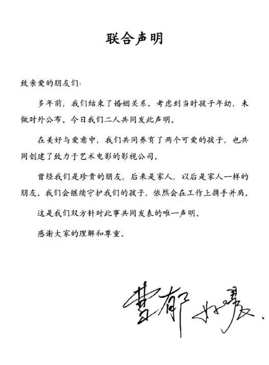 在声明中,他们表示二人多年前就已经结束了婚姻,考虑到孩子年幼,所以未对外公布,如今才共同发此声明。